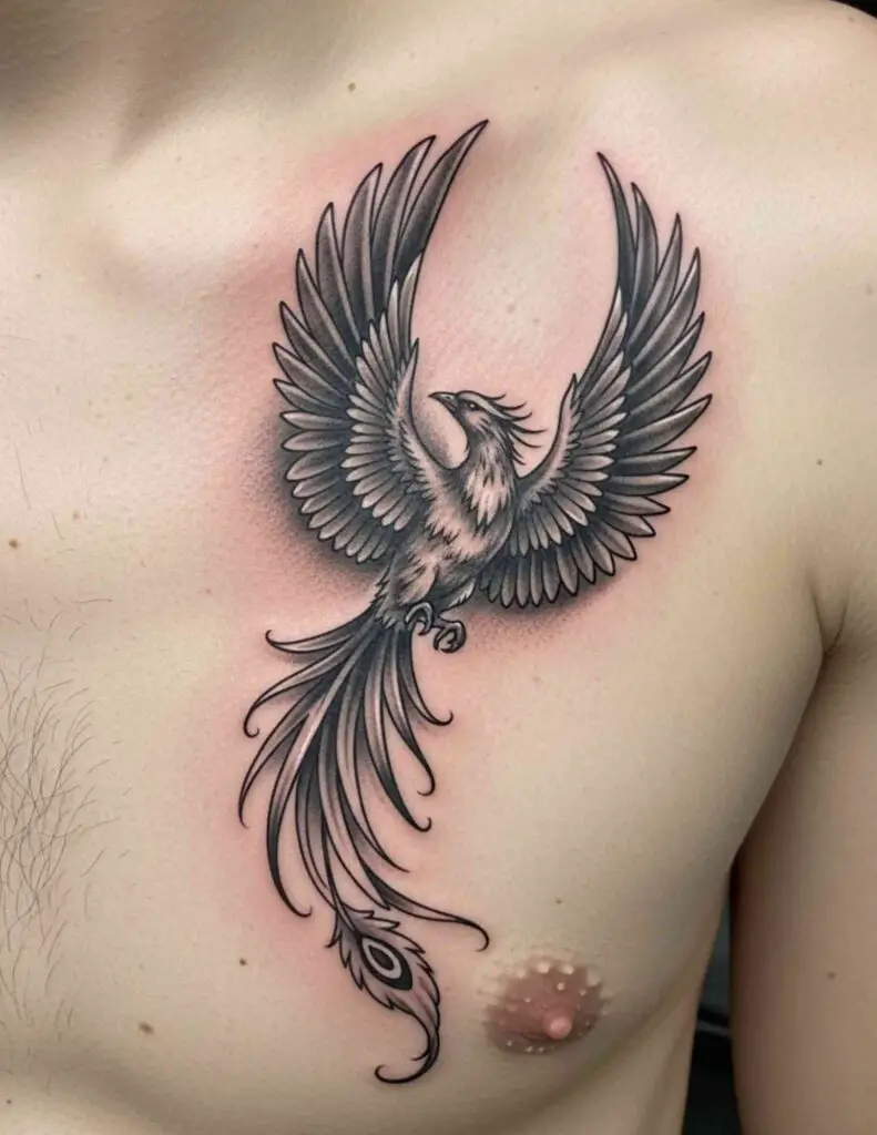 A phoenix centred at the sternum with wings extending across the chest. The chest placement gives the phoenix a confrontational, armorial quality. The bird at the body’s centre, wings spread, is an assertion of identity and resilience that the chest placement amplifies.
