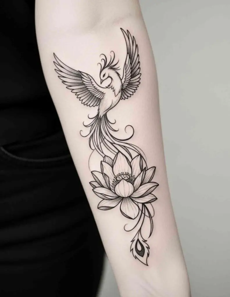 A phoenix rising alongside a lotus flower, both symbols of transformation and emergence from difficult conditions. The combination of two of tattooing’s most powerful rebirth symbols creates a piece that is redundant only if you interpret redundancy as emphasis. Both belong to the same story.