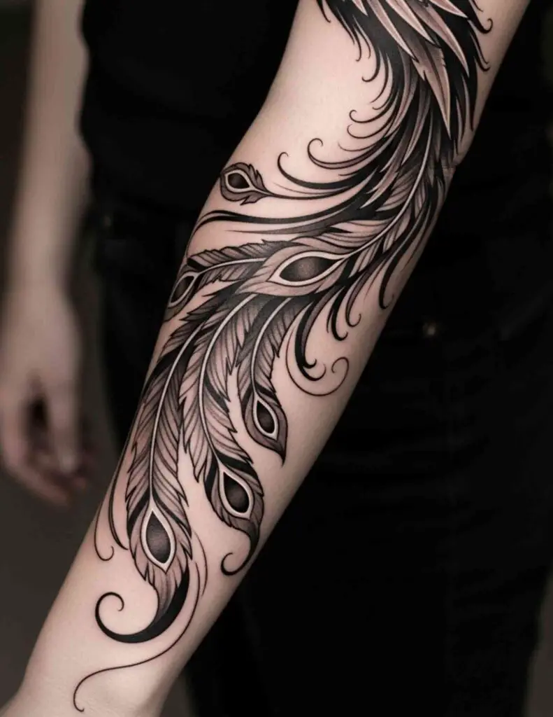 A phoenix ascending along the inner forearm, the bird’s ascending posture following the arm’s vertical axis. The forearm placement is personal and visible. The ascending bird following the arm upward from wrist toward elbow is a composition that uses the placement as part of its meaning.
