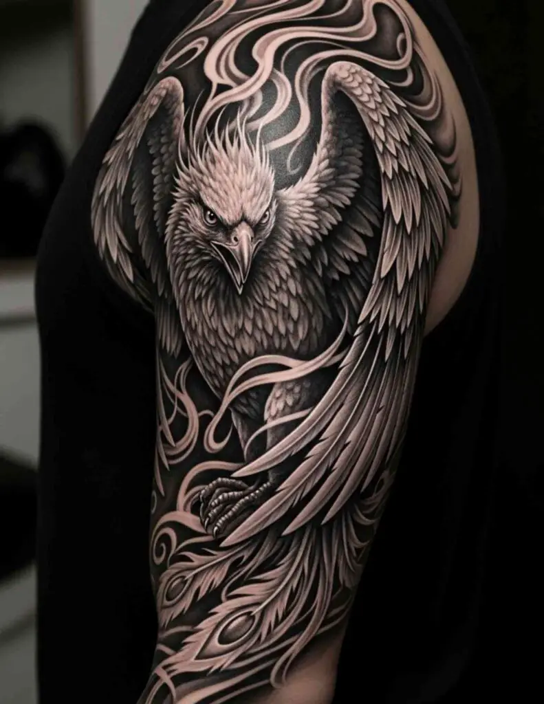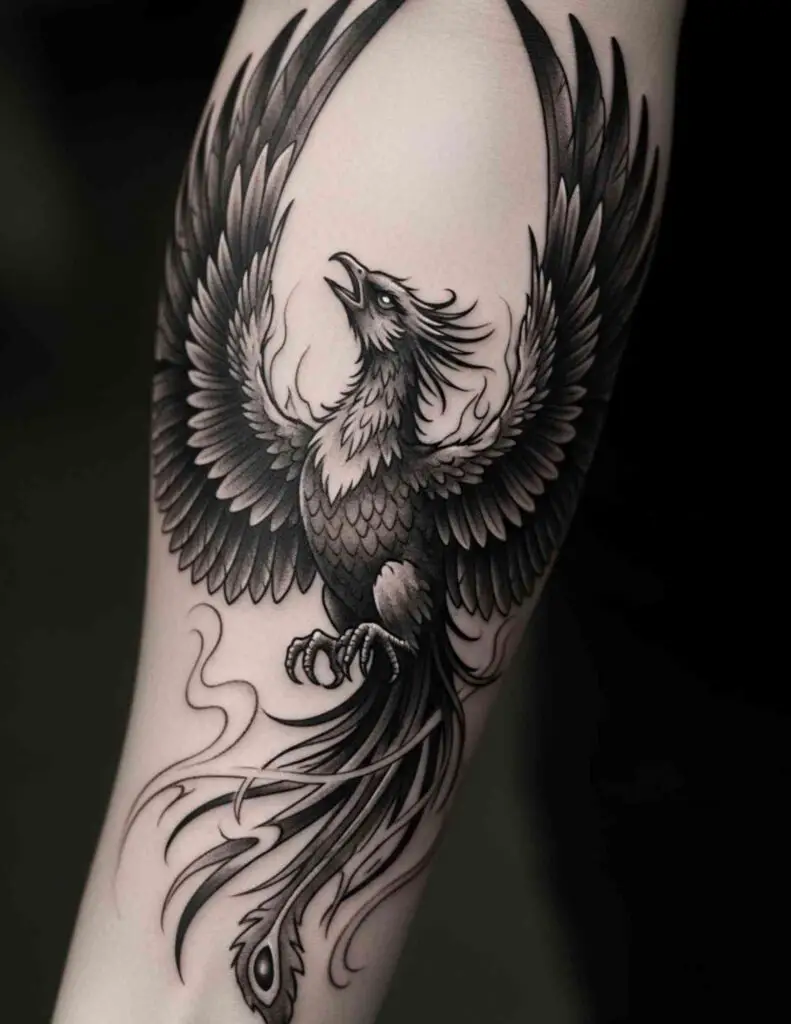 A phoenix in black and grey realism, the fire rendered in grey tones rather than colour. The restraint of black and grey gives the phoenix a different kind of power than the coloured versions. The fire becomes light and shadow rather than orange and red. Subtle and deeply effective.