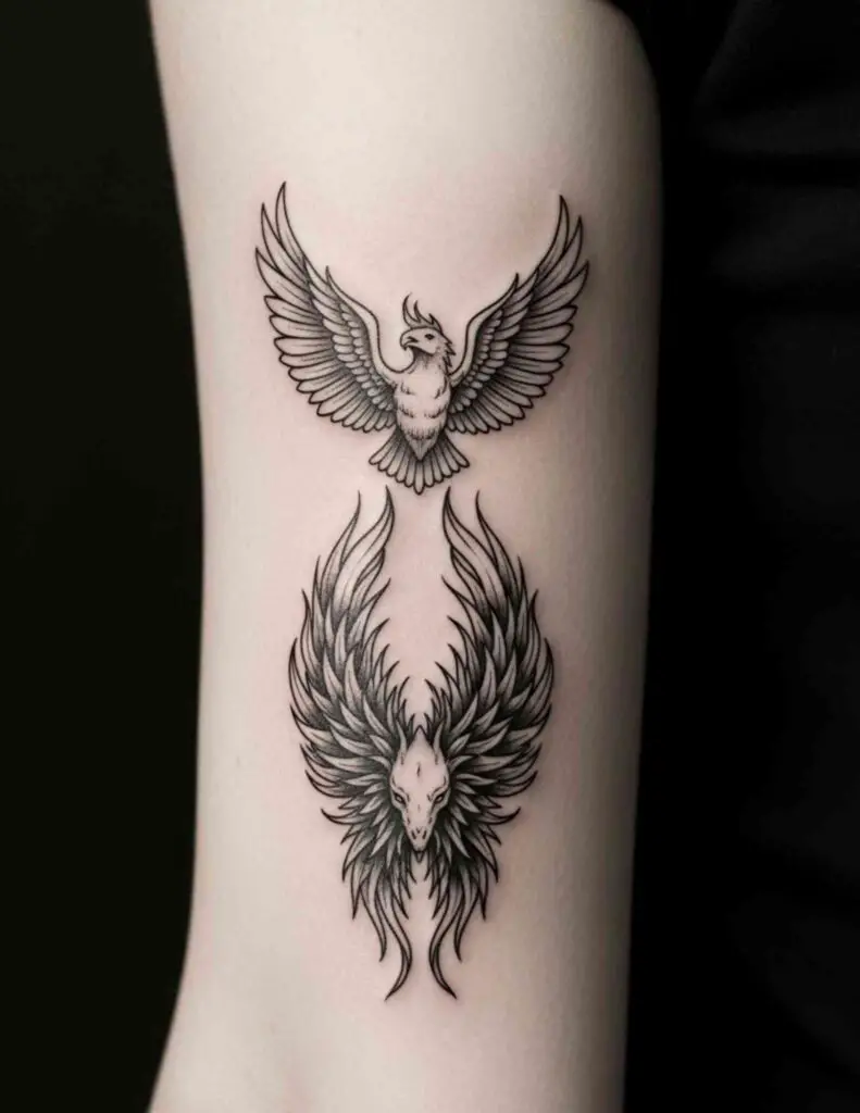 A compact phoenix at wrist scale: the bird in a simple ascending posture with minimal flame detail. Small phoenix tattoos require an artist who can render the bird’s essential qualities at reduced scale. The wrist placement means it is visible and constant.