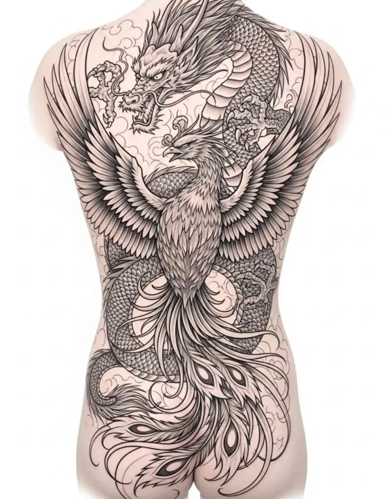 Phoenix and dragon in opposition or harmony, the two most powerful symbols in Japanese and Chinese tattoo traditions. The phoenix and dragon represent complementary forces: fire and water, masculine and feminine, earth and sky. Their pairing is ancient and carries the weight of that tradition.