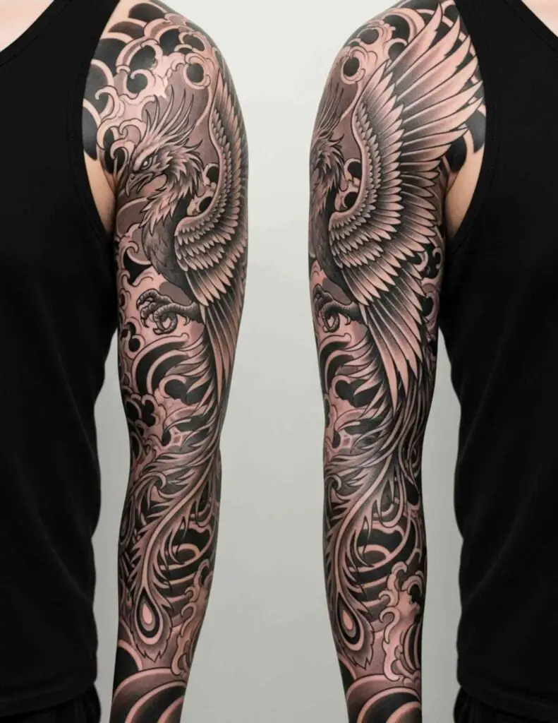 A phoenix as the central subject of a full sleeve, with fire and feather elements flowing through the design from shoulder to wrist. The sleeve format allows the bird’s movement to be expressed across the arm’s full length. The ascending form of the phoenix suits the sleeve’s top-to-bottom composition.