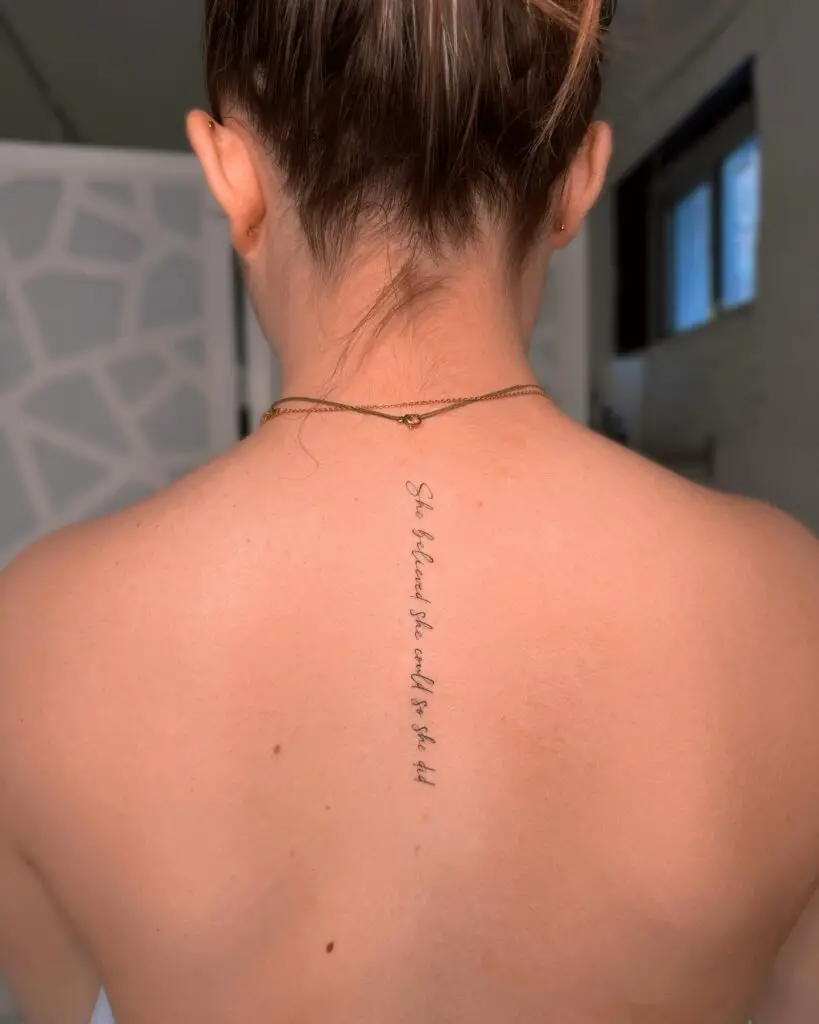 It works beautifully in a flowing cursive script along the forearm, or as a delicate single line on the collarbone. Many women choose to personalize it further — swapping “she” for “I” to make it even more direct and affirming.