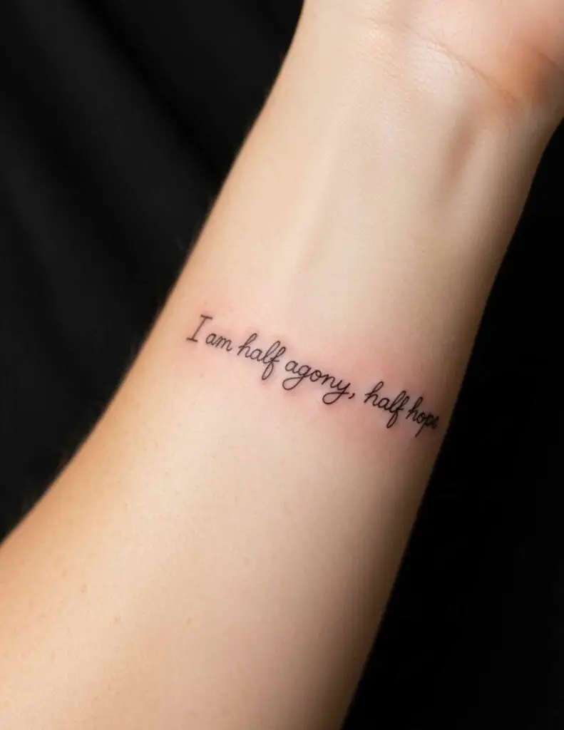For the classic literature devotee, there’s a lifetime’s worth of tattoo-worthy lines. Virginia Woolf’s “You cannot find peace by avoiding life” is a favourite. Jane Austen’s wit offers gems like “I am half agony, half hope.” Even Shakespeare — “Though she be but little, she is fierce” from A Midsummer Night’s Dream — remains a perennial choice for women who want something rooted in literary history.