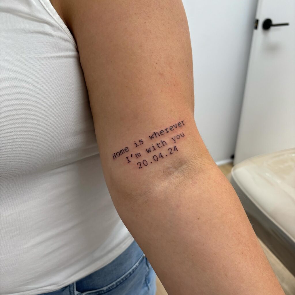 “Forever yours,” “home is wherever I’m with you,” or even a date formatted as Roman numerals alongside a short phrase — these tattoos are intimate, romantic, and entirely unique to the couple.
