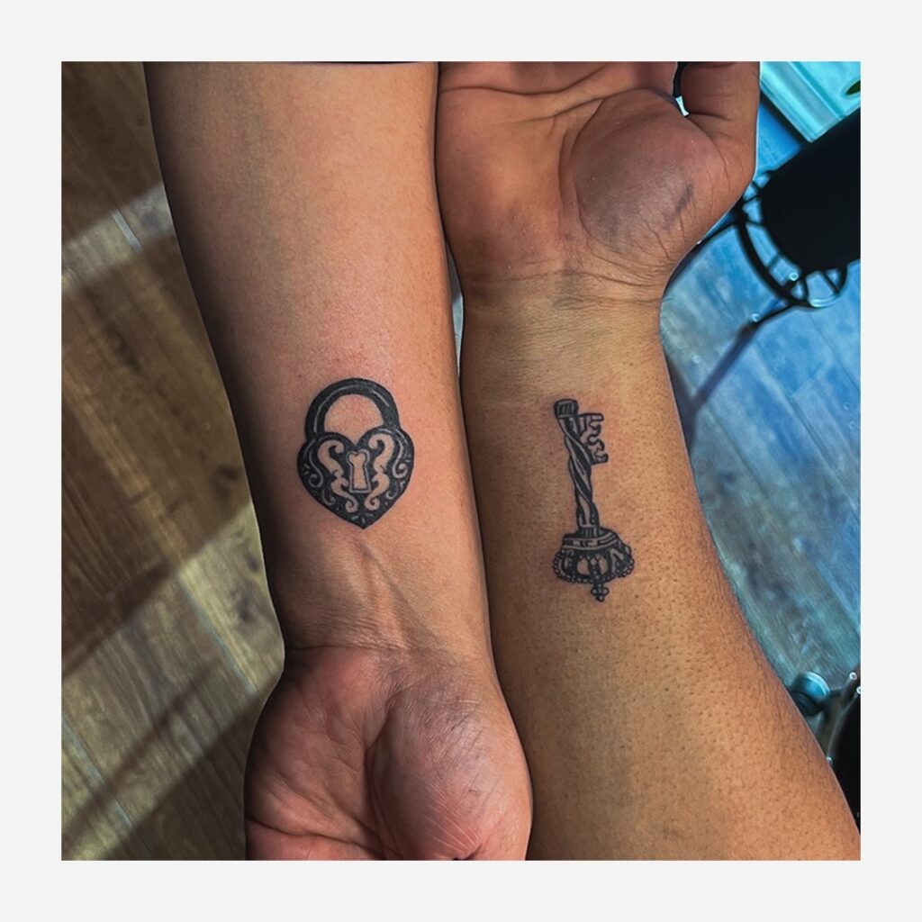One sibling wears the lock, one wears the key. There is a private meaning here: each holds something the other needs. The lock and key as sibling tattoo suggests a relationship of mutual access, that you hold the door open for each other.
