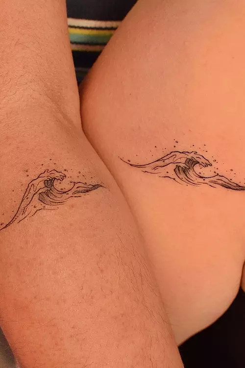 The same wave design in the same placement. The ocean as a shared metaphor: powerful, constant, the same water everywhere. Simple fine line wave or a detailed Japanese-influenced wave. Either works as a paired design.