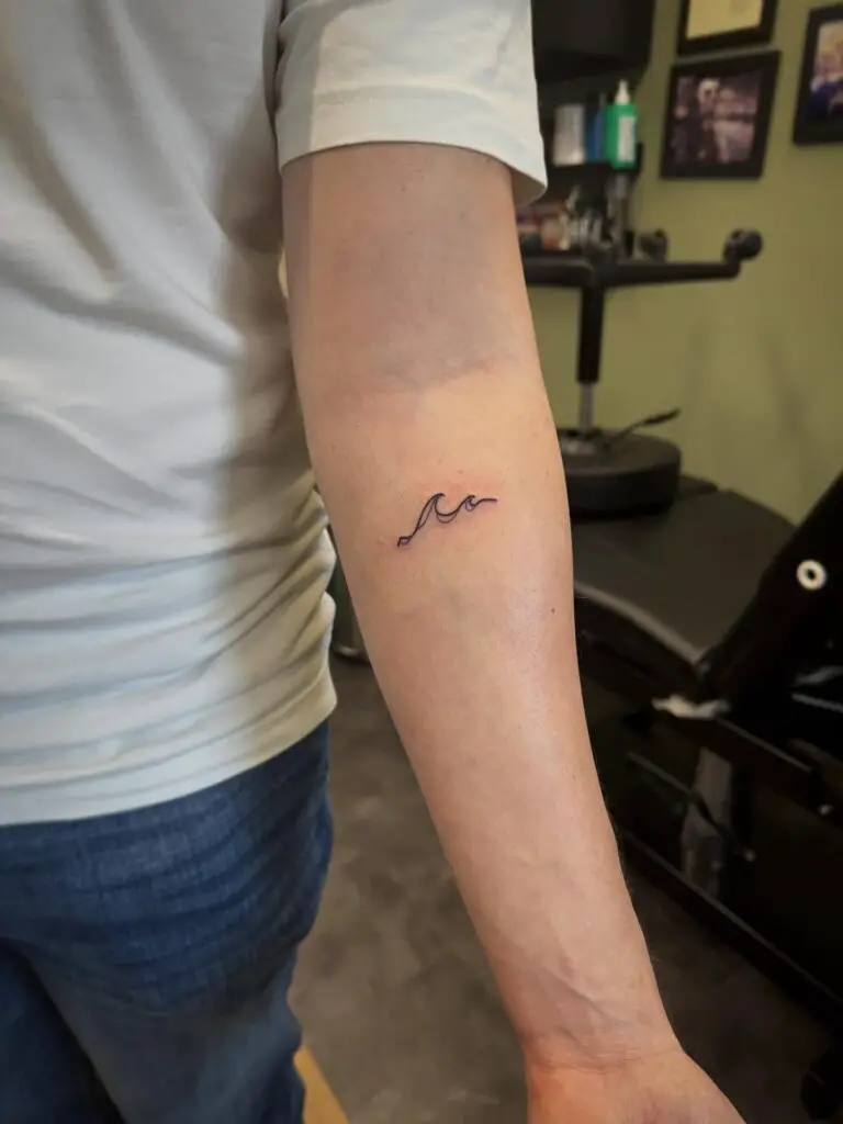 A simple line depicting an ocean wave symbolises strength, change, and the beauty of nature’s power. This design works beautifully as a small tattoo on the wrist, ankle, or along the ribcage. The continuous flowing line creates a meditative quality that feels both modern and timelessly elegant.