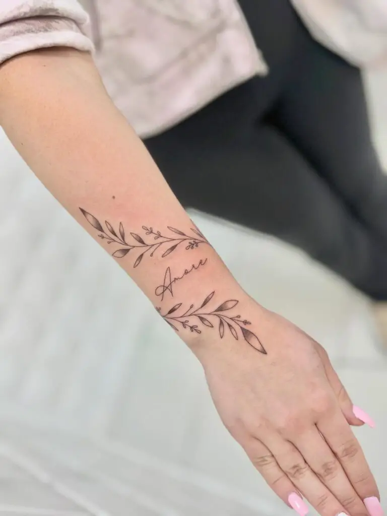 A delicate vine or branch with minimal leaves creates flowing, organic elegance that works wonderfully wrapping around the wrist, ankle, or along the ribs. This design represents growth, resilience, and the quiet beauty of natural things. The flowing lines ensure timeless appeal that sits perfectly on the body.
