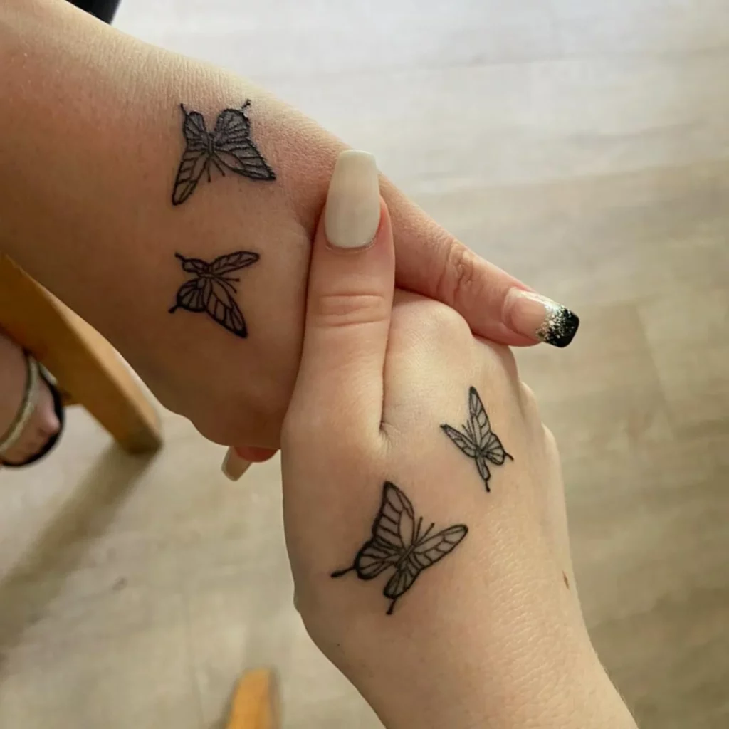 The same idea, two different species. Each sister’s butterfly is distinct but the concept is shared. Accurate species identification in fine line botanical style makes both designs specific rather than generic.