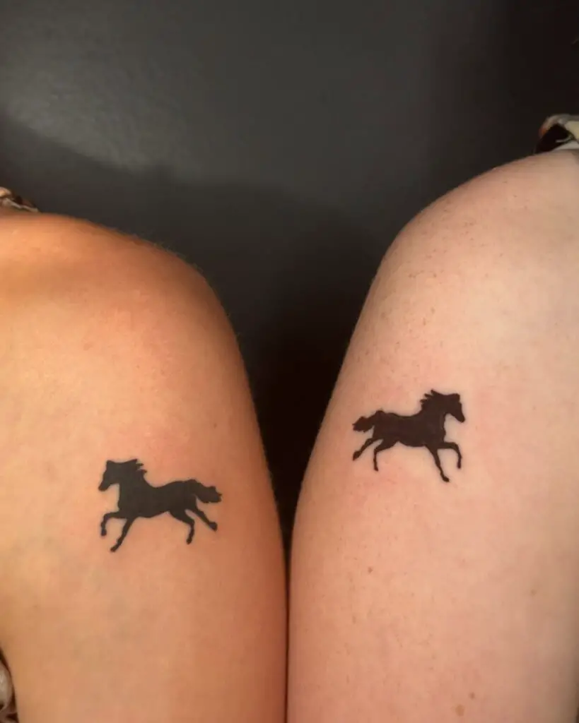 An animal with specific meaning to their shared history, rendered identically on each sister. Not a generic choice but the specific animal from their childhood, their family home, or the inside joke that’s been running for twenty years.