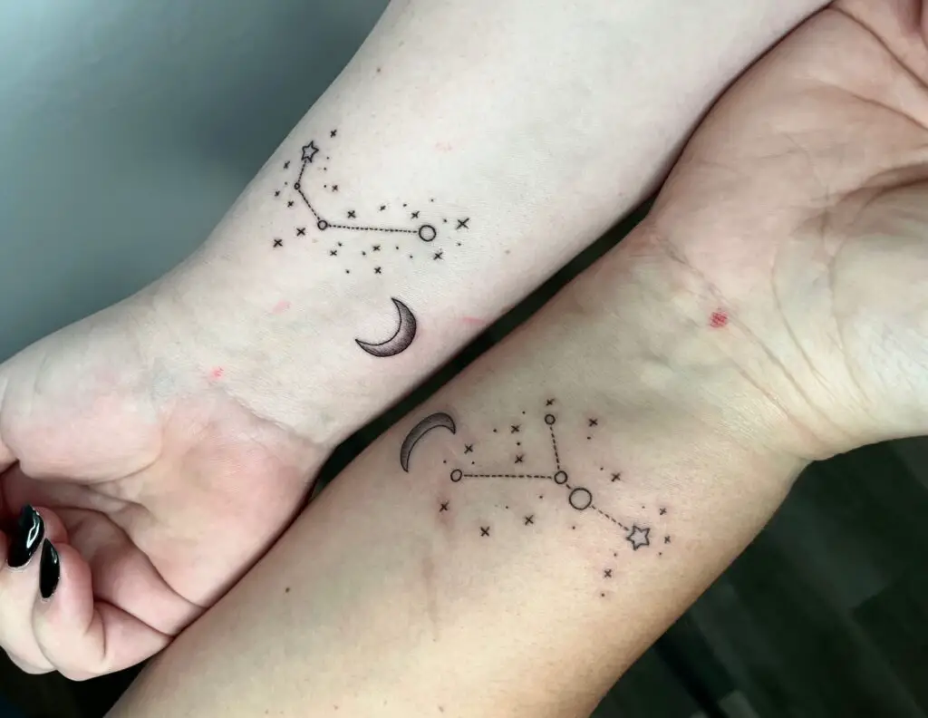 A constellation significant to both sisters, the same star pattern rendered identically on each. The shared sky above a shared history.