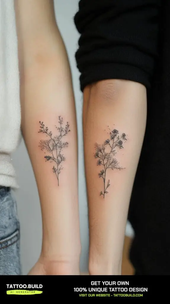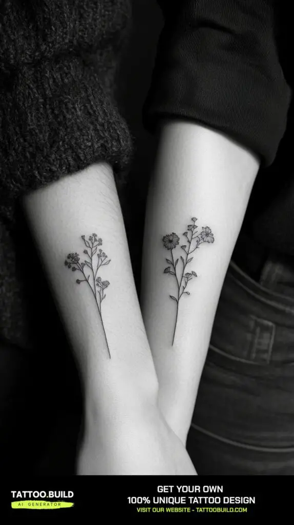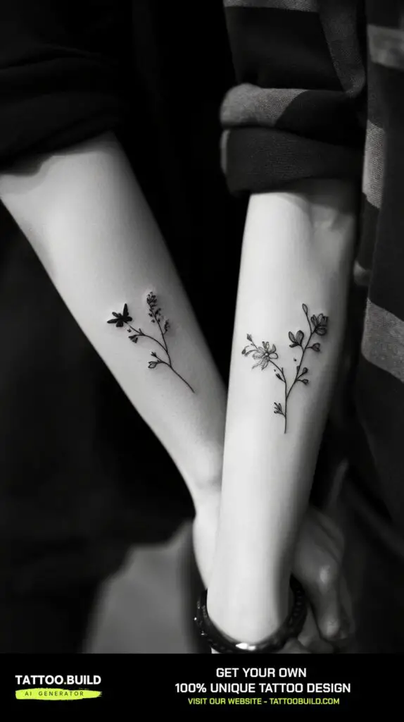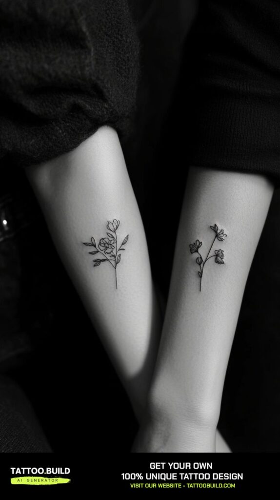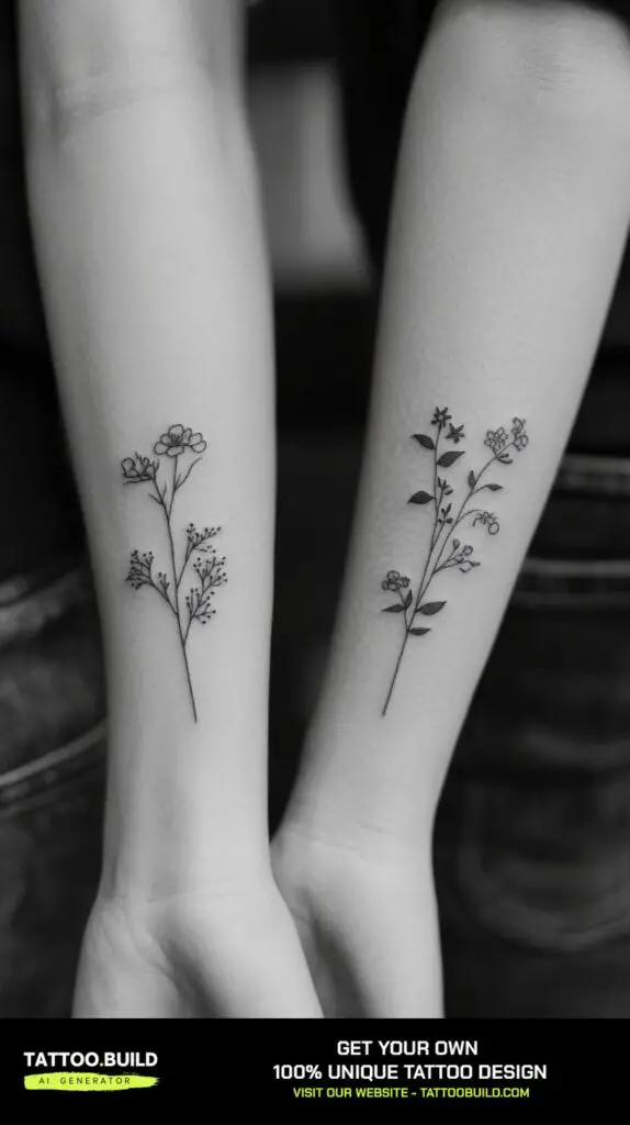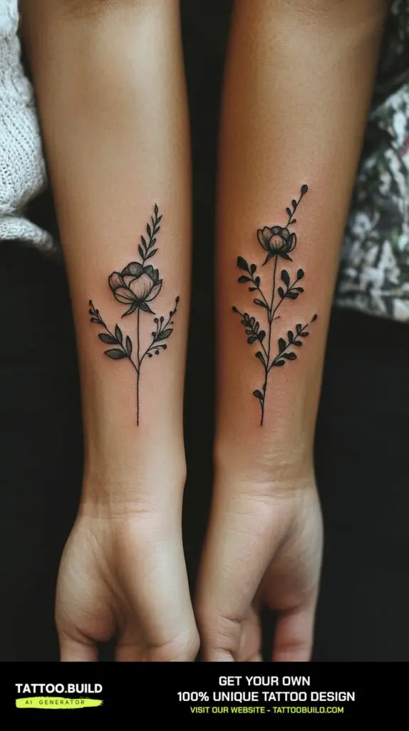 These delicate floral tattoos are a perfect choice for friends who appreciate the elegance of simplicity. Each design features thin stems with small blossoms and leaves, symbolizing beauty, growth, and individuality within friendship. It’s a subtle and graceful way to represent a bond that’s unique and beautiful.