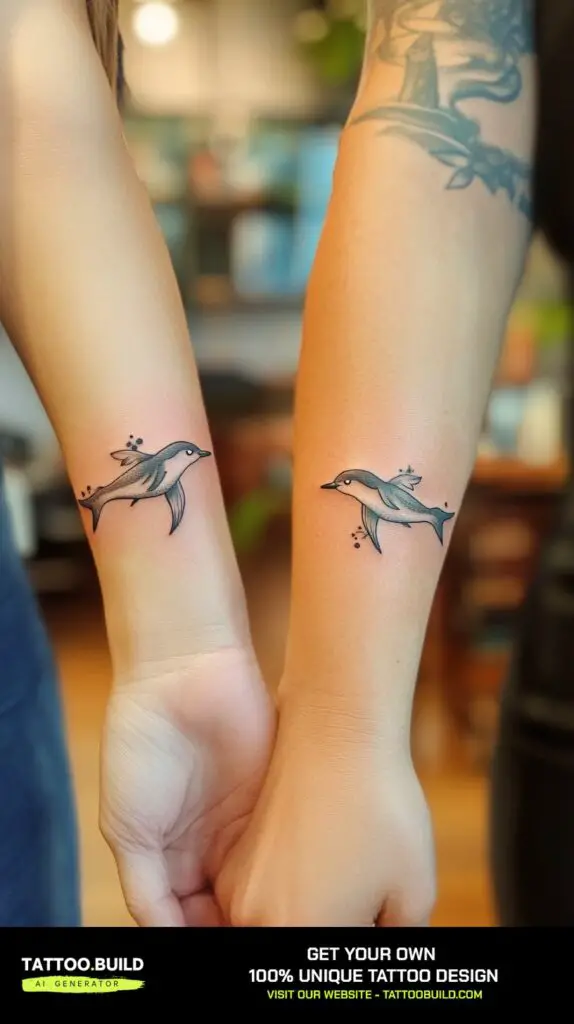 This pair of dolphins represents joy, freedom, and playfulness, perfect for best friends who share an adventurous spirit. The dolphins are small and colorful, bringing a lively touch to this tattoo design. It’s ideal for besties who enjoy making memories together in water or simply love marine life.