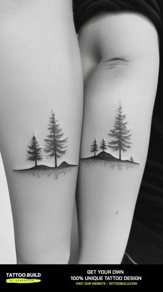 This forest landscape tattoo showcases a series of pine trees on a hill, symbolizing a shared love for nature and adventure. It’s ideal for friends who enjoy exploring the outdoors together or have memories of hiking trips. The multiple trees represent the strength and unity within the friendship.