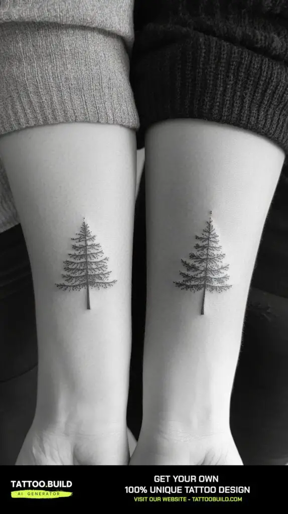 These simple pine tree tattoos represent stability, resilience, and growth. Trees are symbols of strength, and these minimalist designs reflect a friendship that’s grounded and enduring. The simplicity of the pine tree makes it a versatile choice that can fit anywhere on the body.
