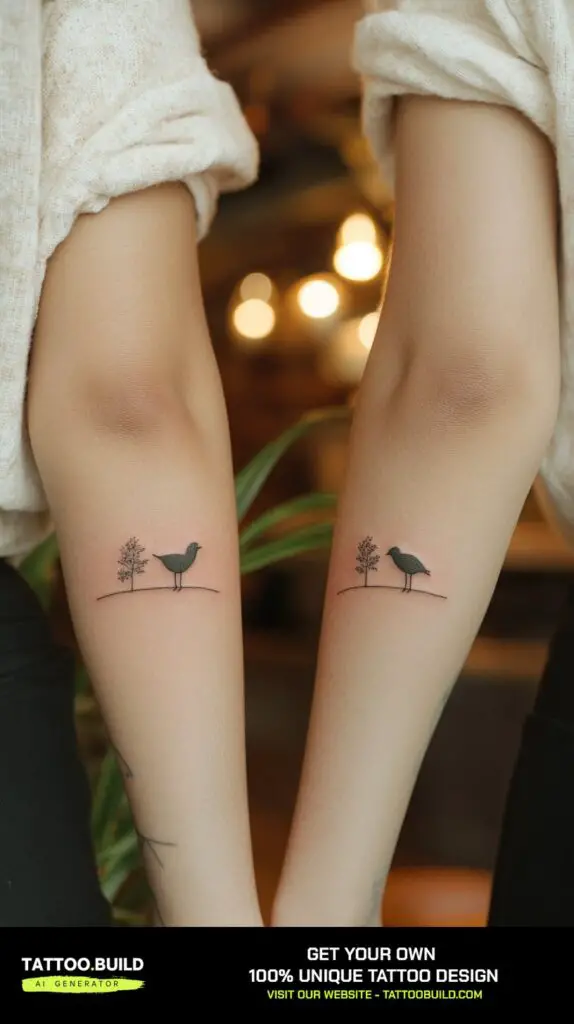 The clean lines and silhouette design give this tattoo a modern look while still holding significant meaning. Perfect for nature-loving friends, these tattoos serve as a reminder of the beauty of enduring friendships, just like trees that withstand the test of time.
