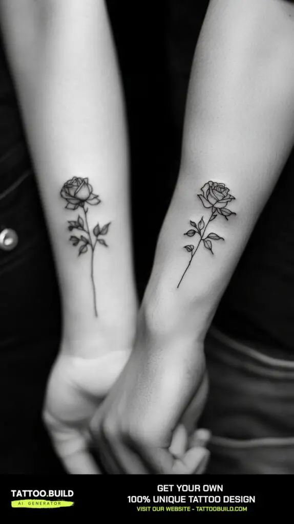 The classic rose tattoo is a symbol of love and passion. With these matching rose tattoos, best friends can show their appreciation for each other’s constant support. The red color of the rose signifies deep affection, making it a heartfelt choice for friends who value loyalty.