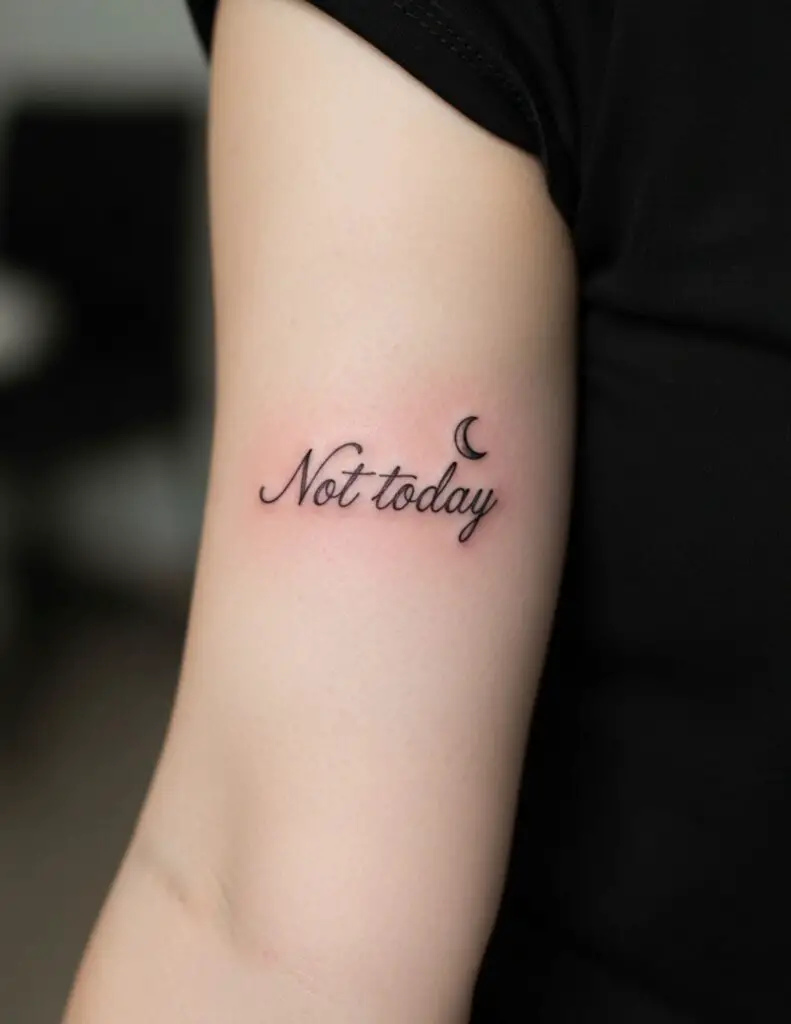 Two words that carry the specific quality of recovery decision-making: not forever, not absolutely, but not today. The day-by-day quality of recovery distilled into a direct refusal. In script on the inner forearm where it is seen when temptation is present.