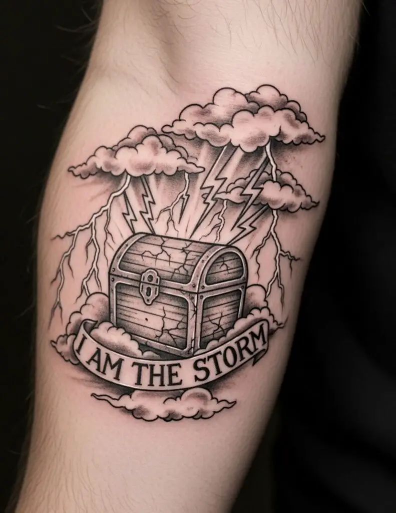 A phrase about internal strength discovered through difficulty. Not the person to whom difficult things happen but the force that moves through difficulty. Bold lettering on the forearm or across the chest.