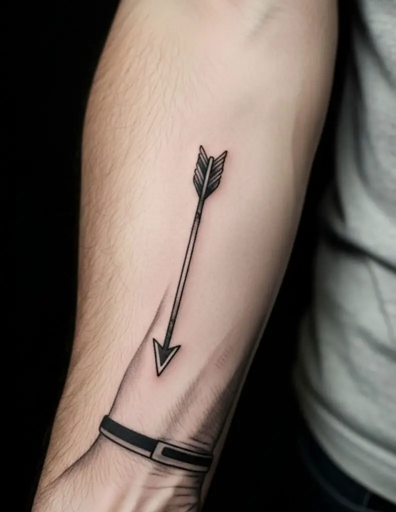 An arrow: drawn back before it moves forward. The arrow must be pulled back to gain momentum. The difficult period as the tension that gives direction to what comes next. Simple, direct, and honest about what the backward pull was for.