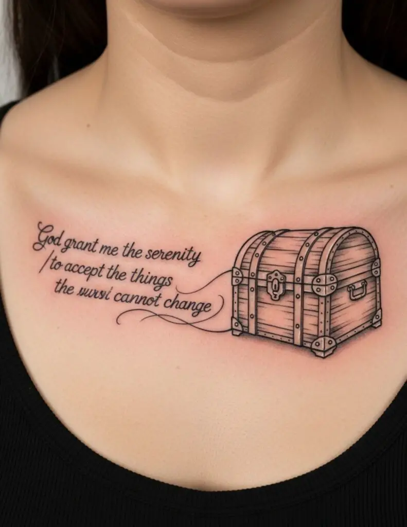 The Serenity Prayer or a portion of it in script: “God grant me the serenity to accept the things I cannot change, courage to change the things I can, and wisdom to know the difference.” For those in 12-step programs, this prayer is a daily practice. As a tattoo it makes that practice visible and permanent.