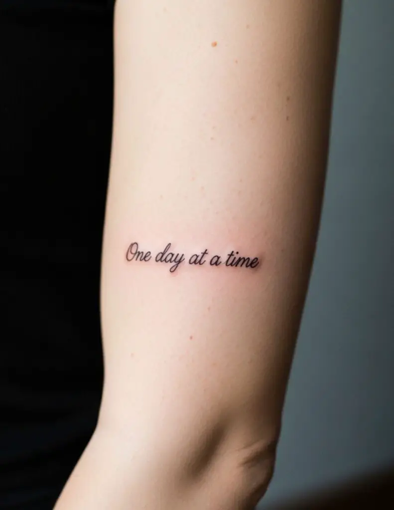 The phrase “one day at a time” in script or clean lettering. The foundational principle of sustained recovery: not forever, not the whole of the future, but this day. The phrase is specific to recovery culture and carries that weight for those who know it.