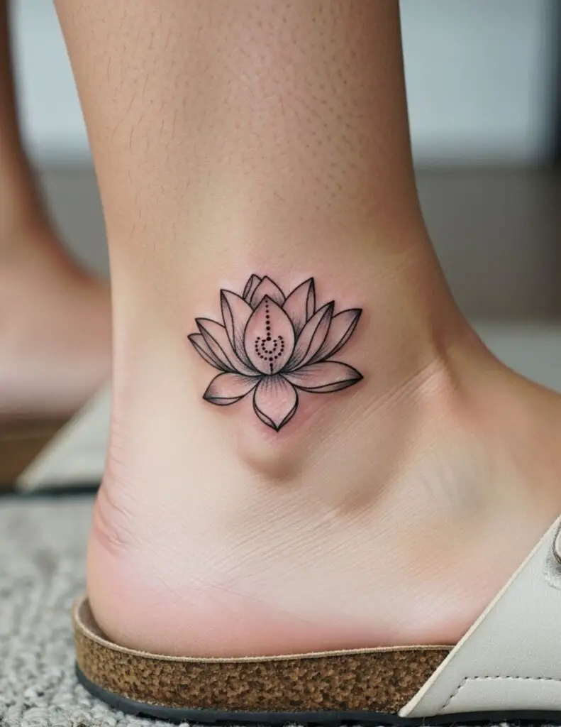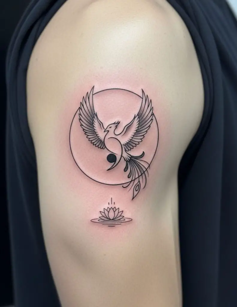 A lotus emerging from water. The lotus’s symbolism of beauty emerging from difficult conditions is not assigned arbitrarily: the plant grows from mud and blooms above the water’s surface. For recovery, the metaphor is accurate. In fine line or in colour realism, placed where it is seen daily.