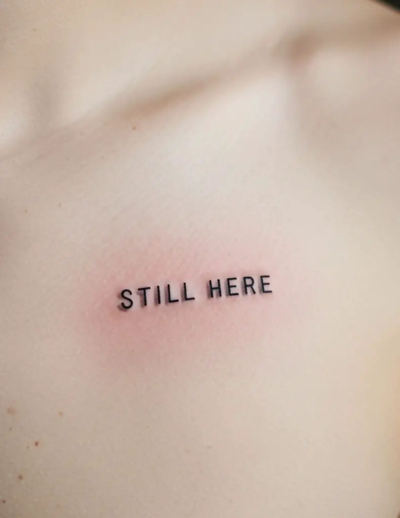 The two words in clean script or lettering. Not an aspiration, not a motto, but a fact. After everything: still here. For people who have been through the hardest parts of addiction and recovery, these two words may be the most accurate and the most powerful statement available.