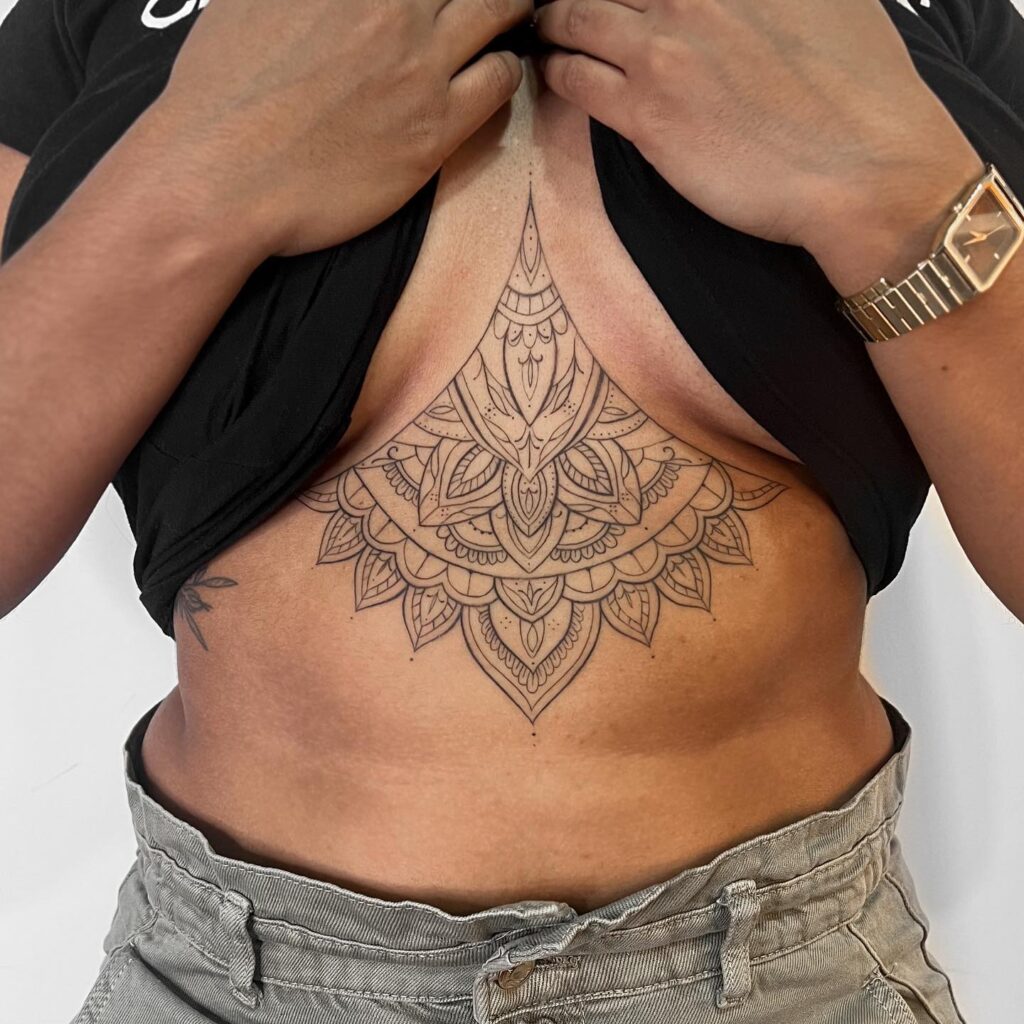 A mandala sternum tattoo is one of the most timeless choices for this placement. The circular, symmetrical nature of mandala designs aligns perfectly with the center of the chest, creating a natural focal point.