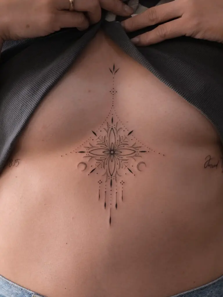 For those drawn to clean lines and precision, a geometric sternum tattoo offers a striking alternative to organic, nature-inspired designs. Interlocking triangles, sacred geometry patterns, and abstract line compositions all work exceptionally well in this placement.