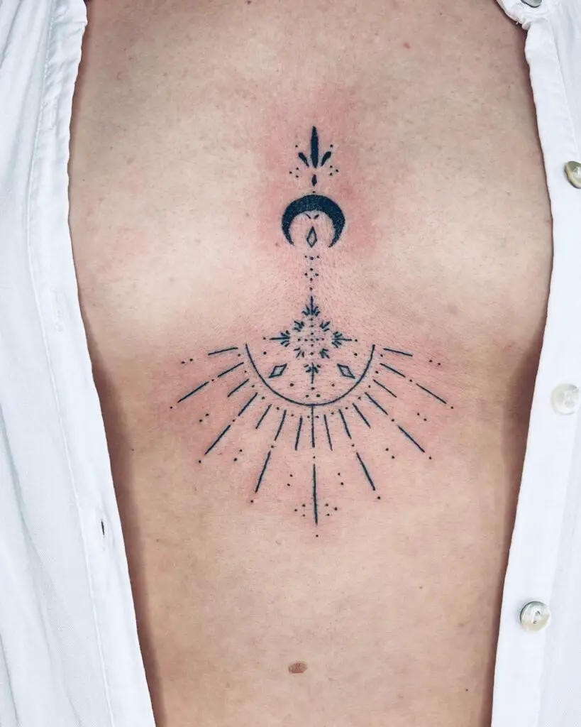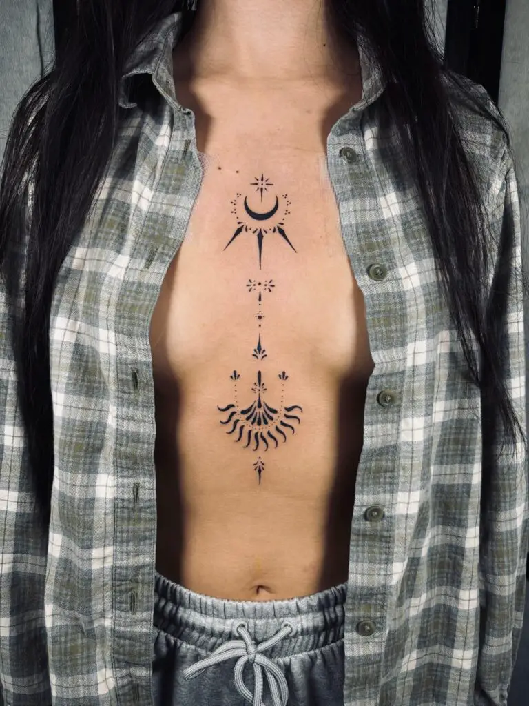 Celestial imagery featuring moons and stars has long been a beloved choice for sternum tattoos. A crescent moon centered at the top of the sternum with trailing stars cascading downward creates a dreamy, ethereal composition.