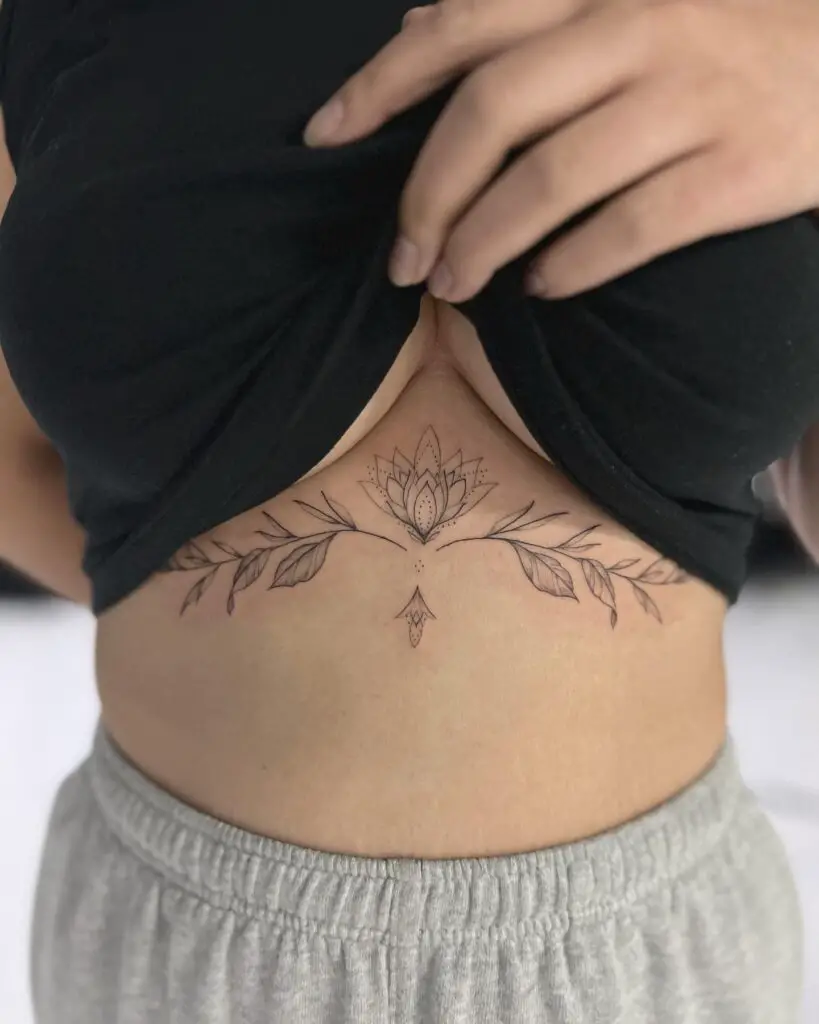 A floral chain draping across the sternum and underboob area is a breathtaking choice that has dominated tattoo inspiration boards for years. Delicate roses, peonies, or wildflowers connected by thin stems create an elegant, jewelry-inspired effect that hugs the body’s natural curves.
