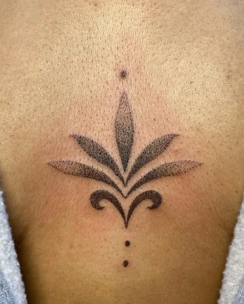 Common subjects for dotwork sternum tattoos include mandalas, sacred geometry, and florals, all of which benefit from the technique’s ability to create complex tonal gradients. This style pairs especially well with fine line outlines for a beautifully multi-textured effect.