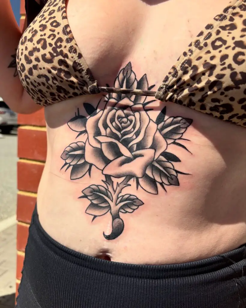 Artists can render them in hyper-realistic detail with soft shading, or opt for a bolder, graphic approach with thick outlines. Adding thorns, leaves, or script elements gives a rose sternum tattoo a more personalized, story-driven quality.