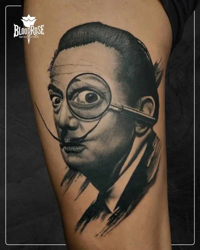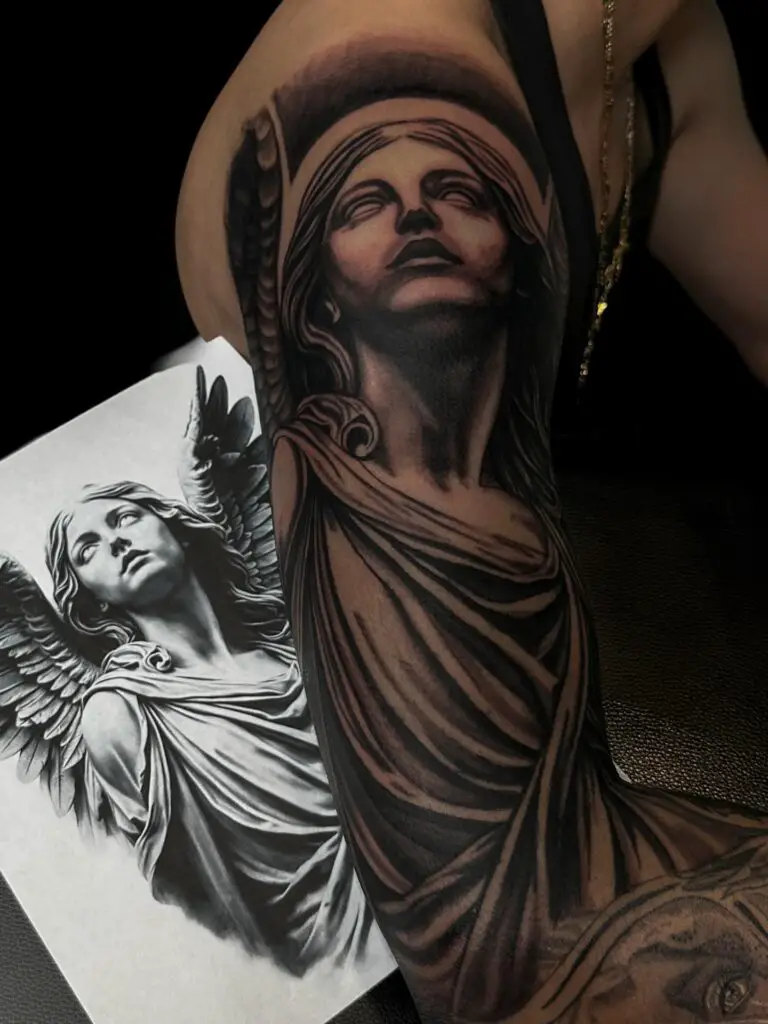 Black and grey realism executed by an artist who has specific experience on dark skin tones. The grey tones in black and grey work require careful calibration against dark complexions: what reads as a highlight on light skin may disappear on dark skin. The highlights and darkest shadows both need adjustment. With an experienced artist, black and grey realism on dark skin can be spectacular.