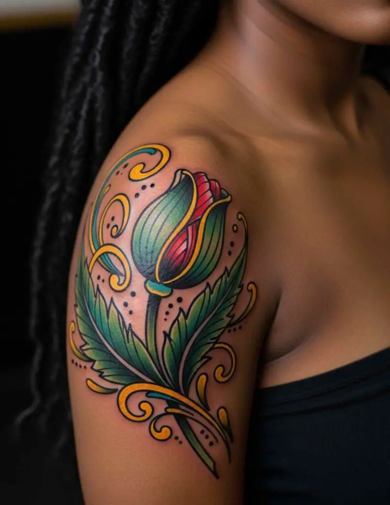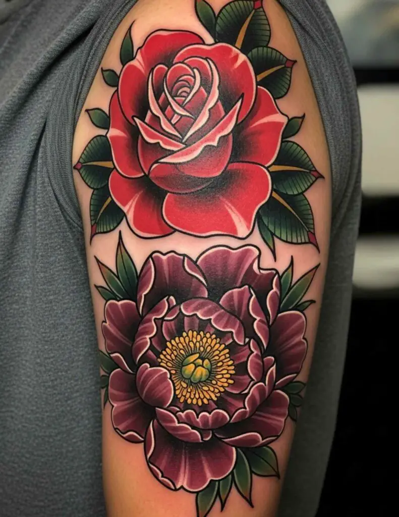 Botanical subjects in neo-traditional style: bold lines, rich deep colour fills, dimensional shading. Deep greens, purples, and blues show well on dark skin. Roses, peonies, and tropical flowers in neo-traditional colour are among the more reliable coloured options.