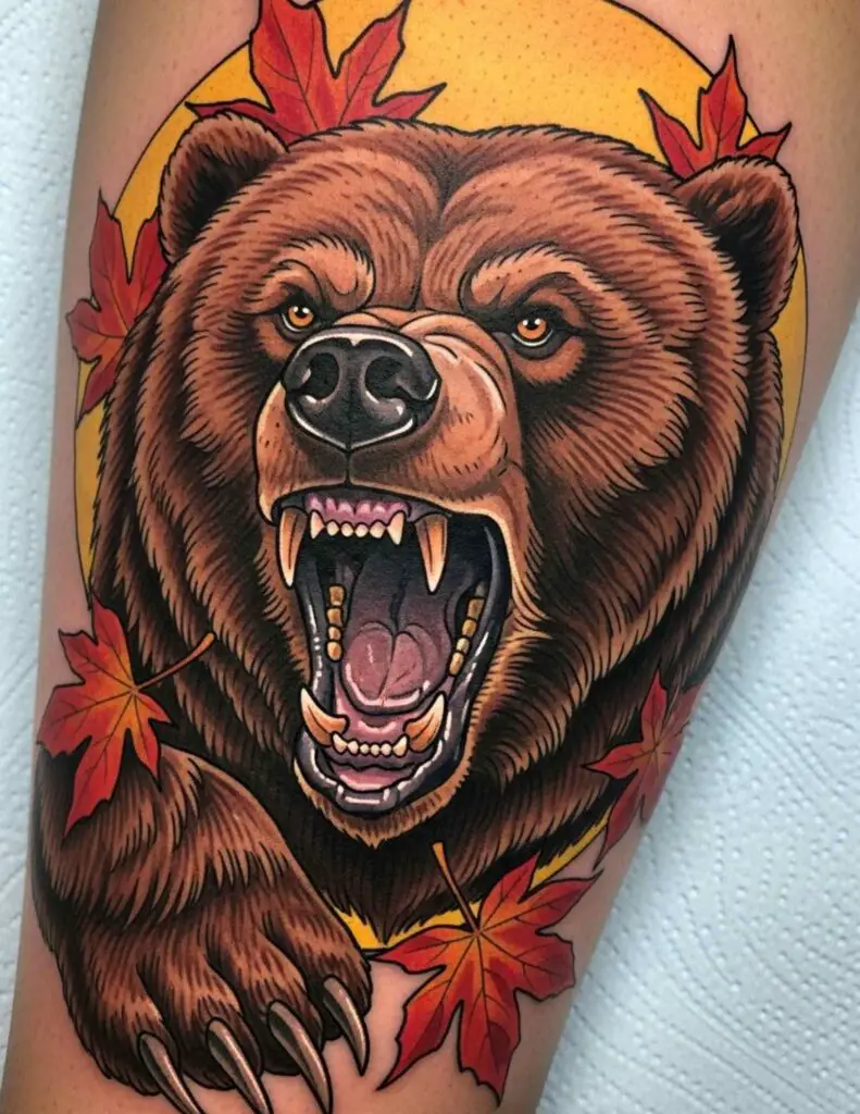 An animal subject in neo-traditional style with deep, rich colour fills and bold black outlines. The outline weight of neo-traditional tattooing ensures the design remains readable even where the colour contrast with dark skin is lower. The bold lines do the work that pale tones cannot.