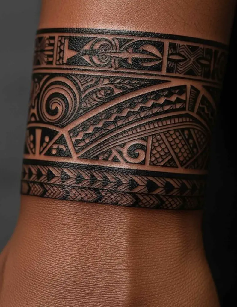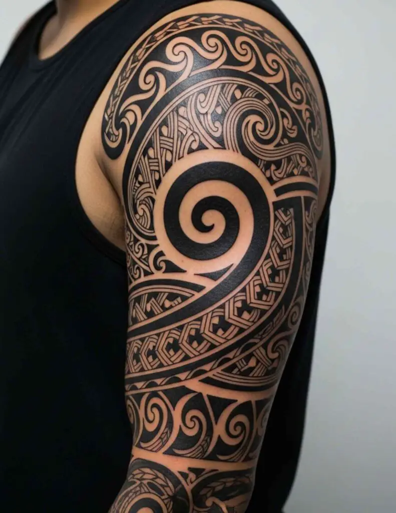 Maori-inspired koru spirals and geometric patterns in bold blackwork. If Maori cultural connection is not present, it is worth researching the designs carefully and choosing a respectful approach. Broadly, Pacific Islander-influenced blackwork geometric designs have a long history of working excellently on dark skin tones.