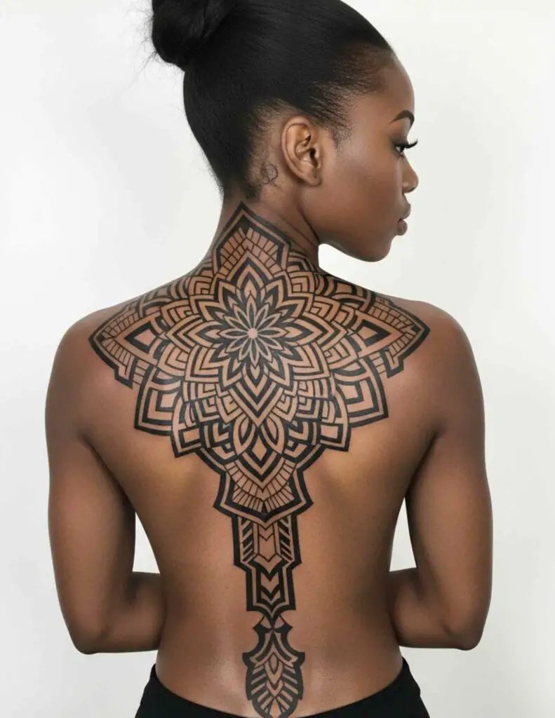 Metatron’s Cube, the Flower of Life, or other sacred geometry in clean bold linework. These designs use repeated geometric forms and the intersections between them. On dark skin, the lines need sufficient weight to remain clear, and an artist with experience in sacred geometry on deep complexions will calibrate the line weight accordingly.