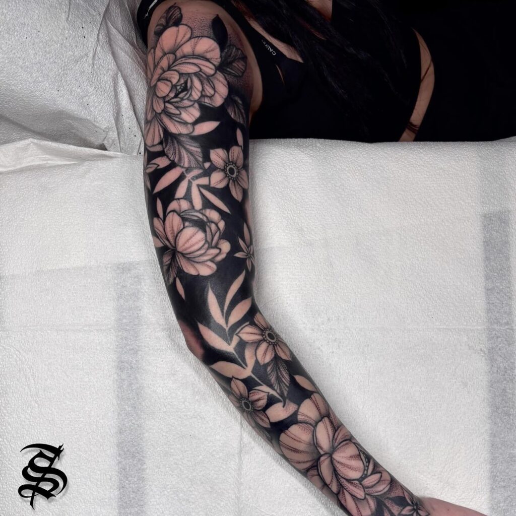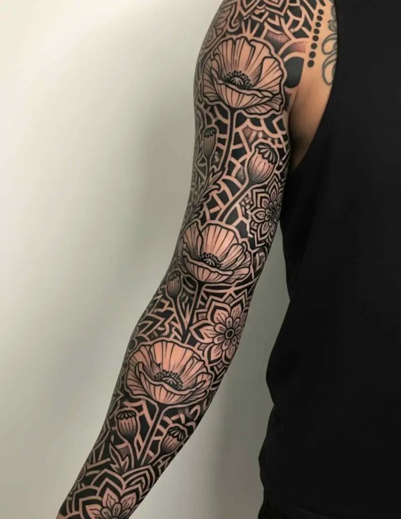 A sleeve in bold blackwork, the design covering the full arm from shoulder to wrist in black ink. Blackwork sleeves on dark skin are visually extraordinary, the black ink creating strong graphic presence against the complexion. Some of the most impressive sleeve work in contemporary tattooing is blackwork on dark skin.