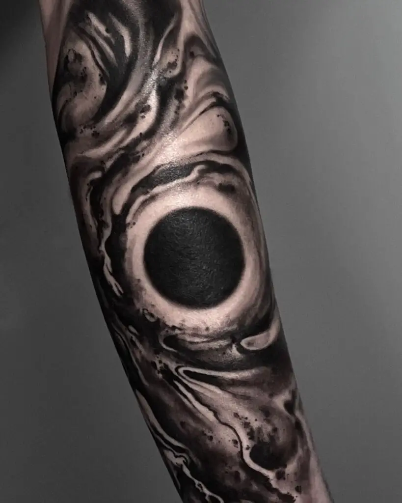 Abstract compositions in blackwork: non-representational shapes, flowing organic forms, or structured abstract patterns. Abstract blackwork on dark skin emphasises form and texture rather than subject matter. The skin tone becomes a graphic element of the composition.