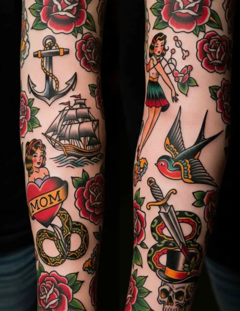 American traditional roses filling the gaps between existing pieces. The traditional rose is one of the most established and versatile filler elements in tattooing’s history. Bold linework roses in red and green (or black and grey) suit traditional sleeves naturally but can be adapted to neo-traditional work as well.