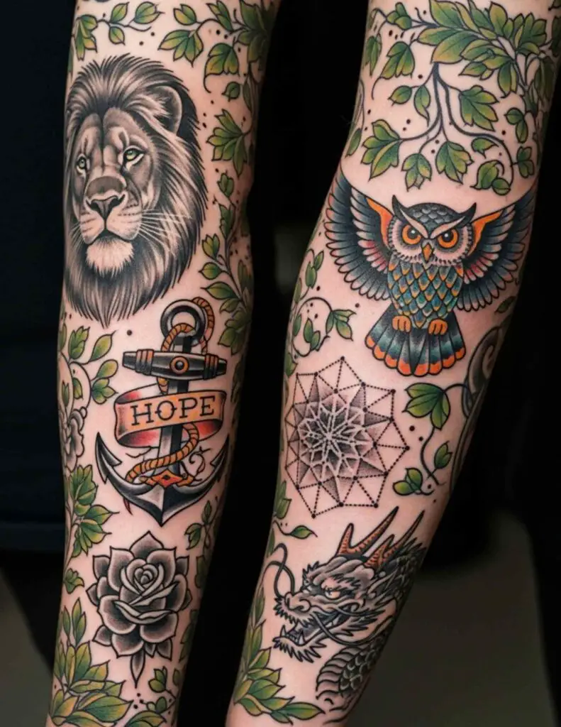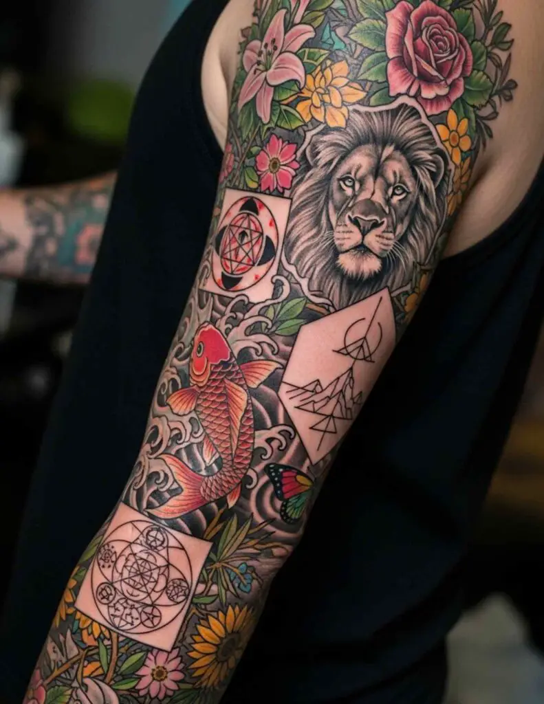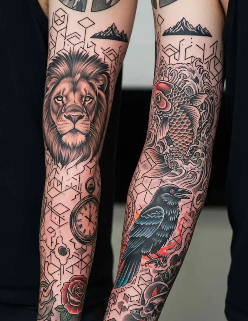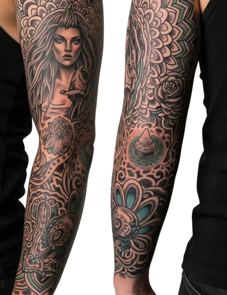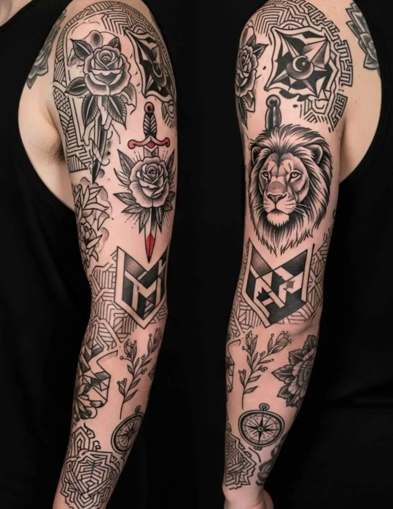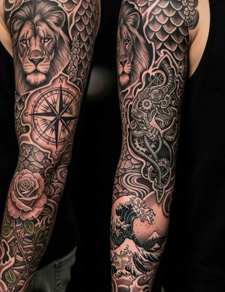 Consult with a tattoo artist who can look at your existing sleeve and propose a filler strategy before committing to any specific element. The filler needs to respond to what is already there: the existing line weights, the colour palette or lack of it, the subjects and their scale. Filler added without this consultation often creates more visual confusion than the negative space it replaces. A good sleeve artist will see the existing work and know what it needs.