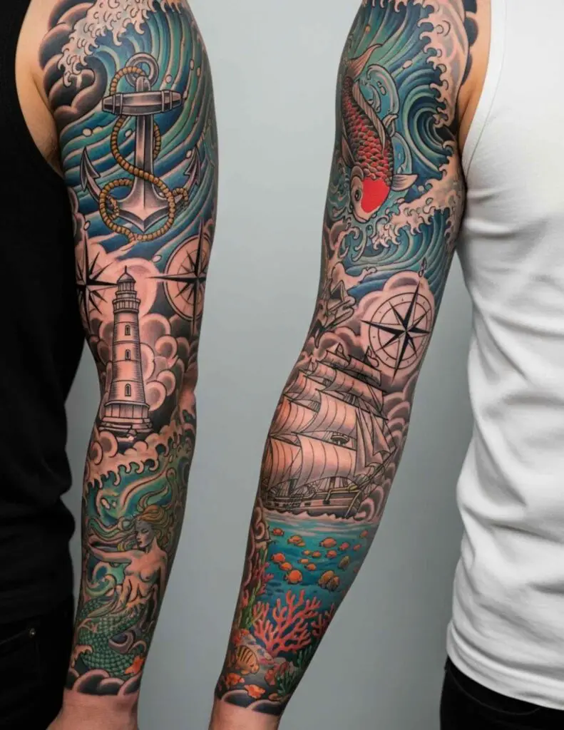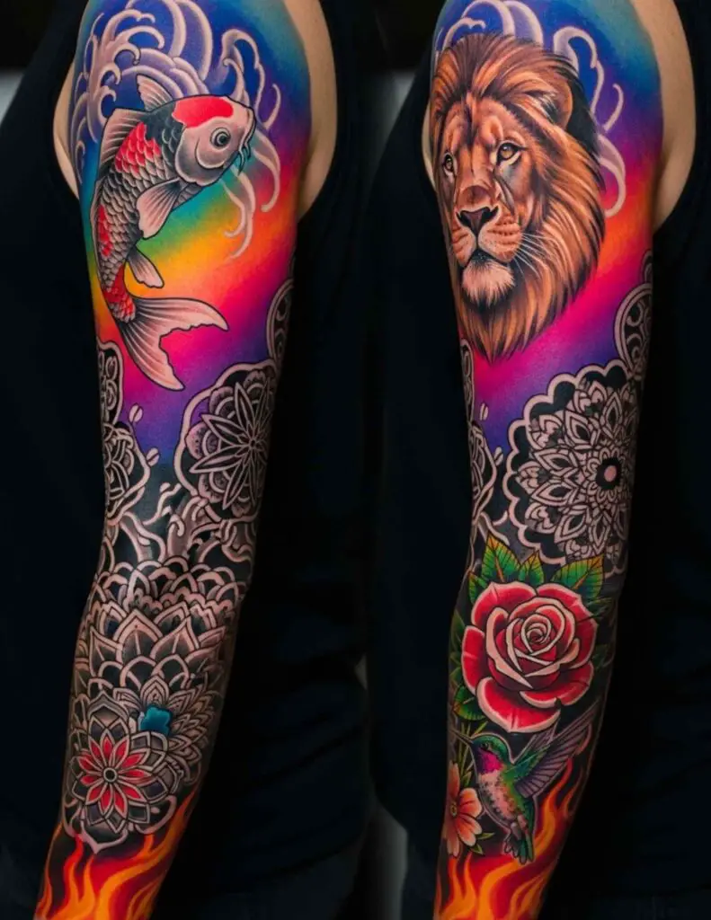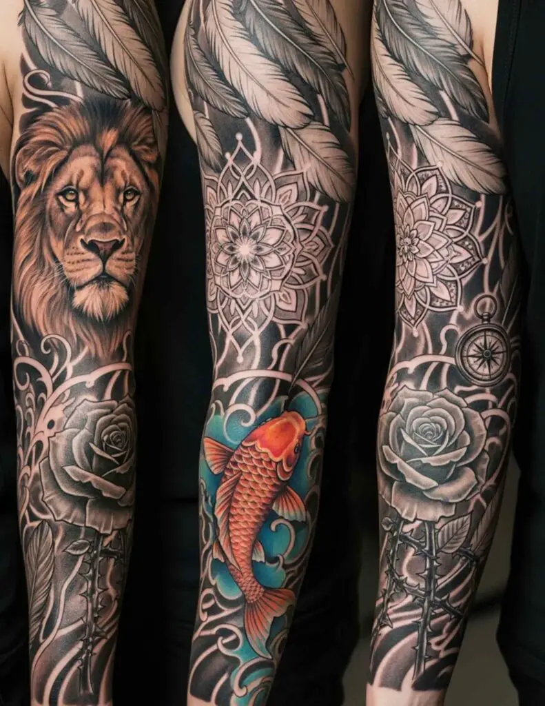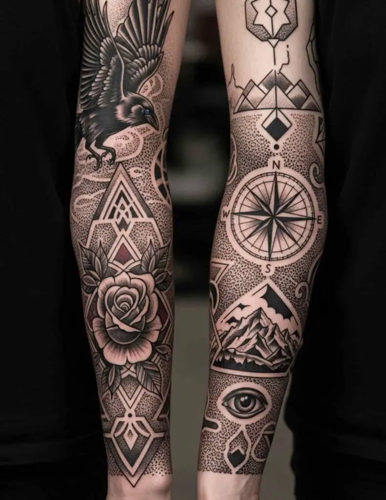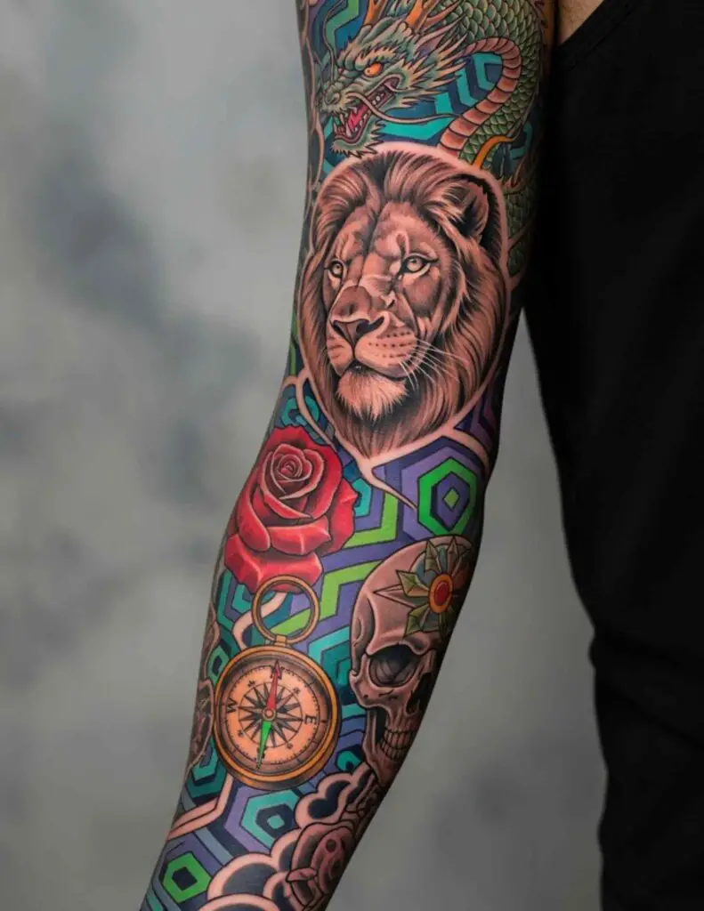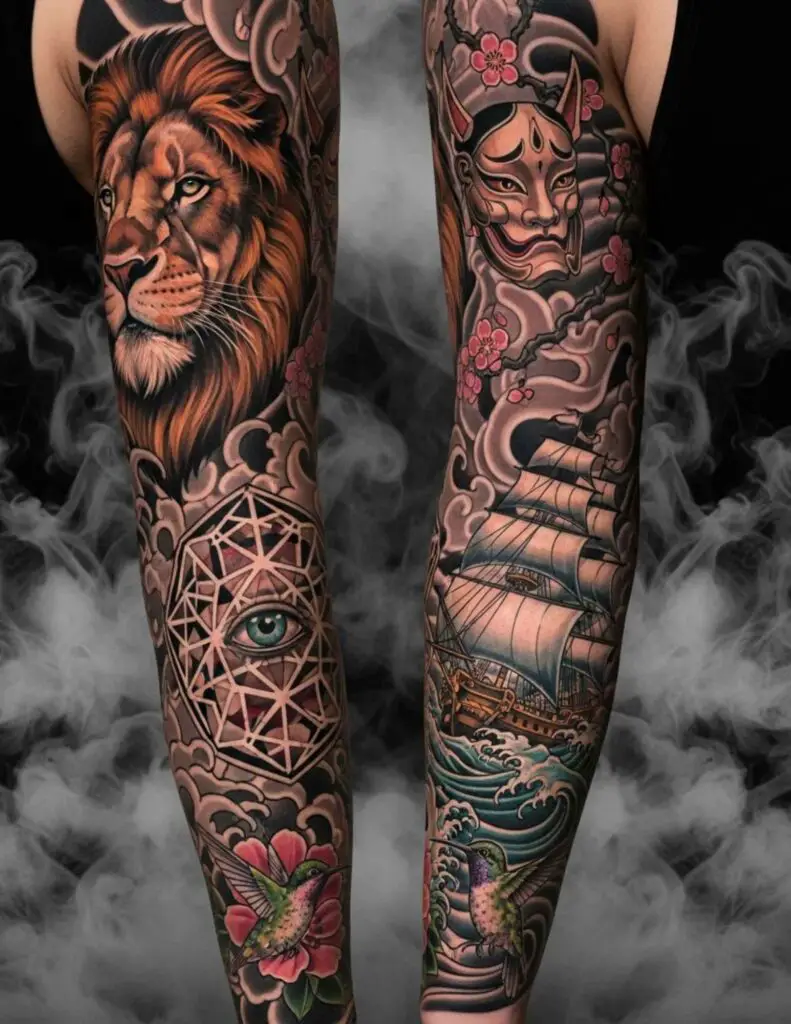 Consult with a tattoo artist who can look at your existing sleeve and propose a filler strategy before committing to any specific element. The filler needs to respond to what is already there: the existing line weights, the colour palette or lack of it, the subjects and their scale. Filler added without this consultation often creates more visual confusion than the negative space it replaces. A good sleeve artist will see the existing work and know what it needs.