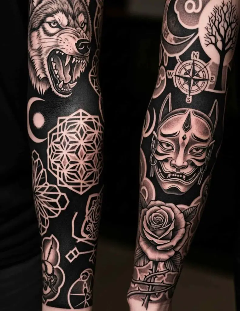 Solid black fill over large areas of the sleeve’s negative space, creating a bold graphic contrast between the inked subjects and the surrounding black. Blackout filler is a decisive commitment: it permanently changes the sleeve’s visual character. Consult with a highly experienced sleeve artist before choosing this approach.