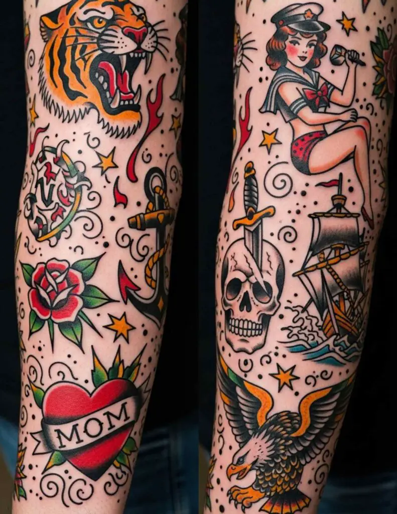Small traditional flash motifs filling the gaps: horseshoes, dice, swallows, playing card elements. In sleeves that already use traditional or neo-traditional subjects, small flash motifs honour the visual tradition of the style and create a sleeve that reads as steeped in tattooing history rather than contemporary isolation.