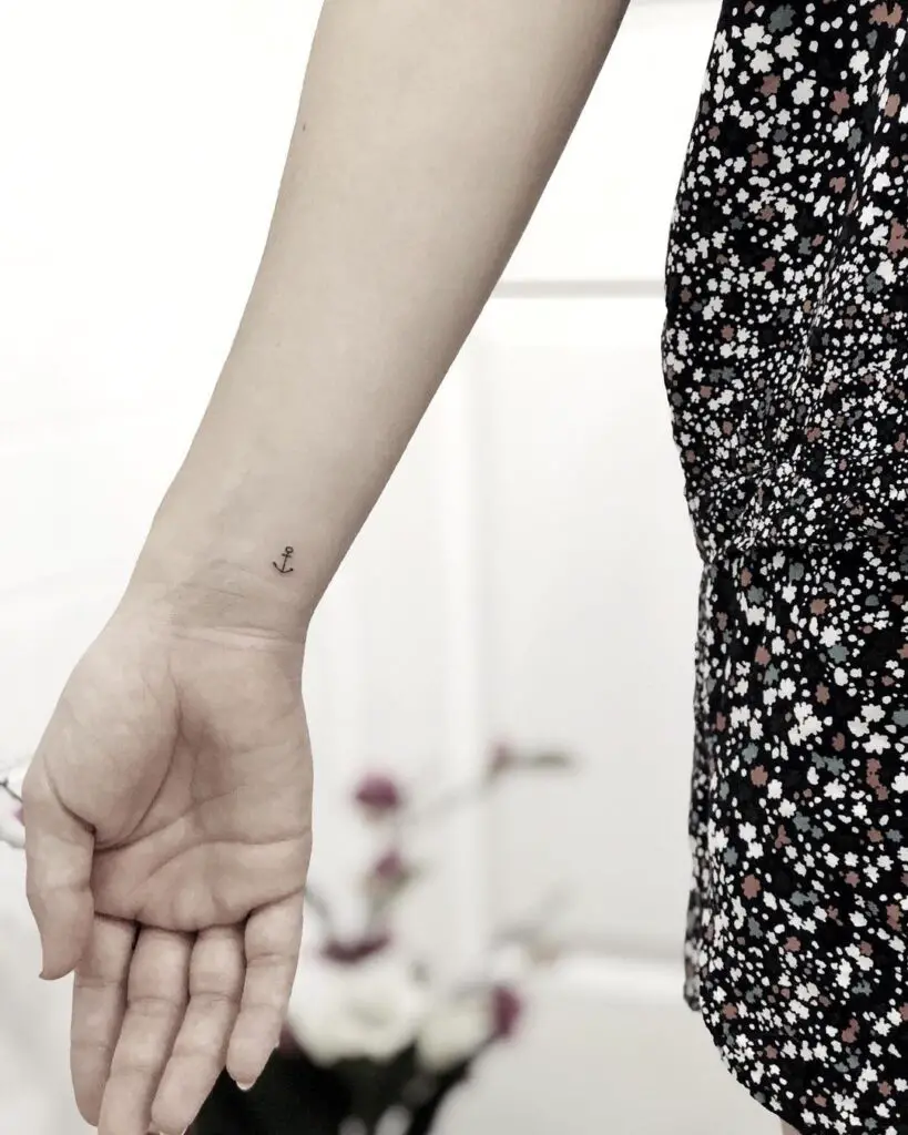 A small anchor in fine line or minimal traditional style. The anchor’s associations with stability, holding ground, and remaining grounded in something solid suit the inner wrist placement where it is seen in moments of drift as much as moments of steadiness.