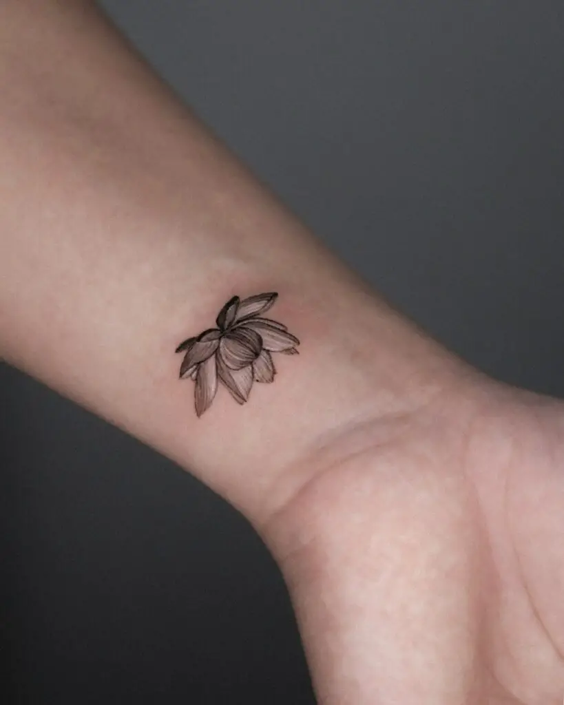 A small lotus in fine line. The lotus’s associations with spiritual development and emergence from difficulty suit the inner wrist placement where it is seen most when looking inward. At small scale, the lotus petals require precision but the form is clean enough to hold.